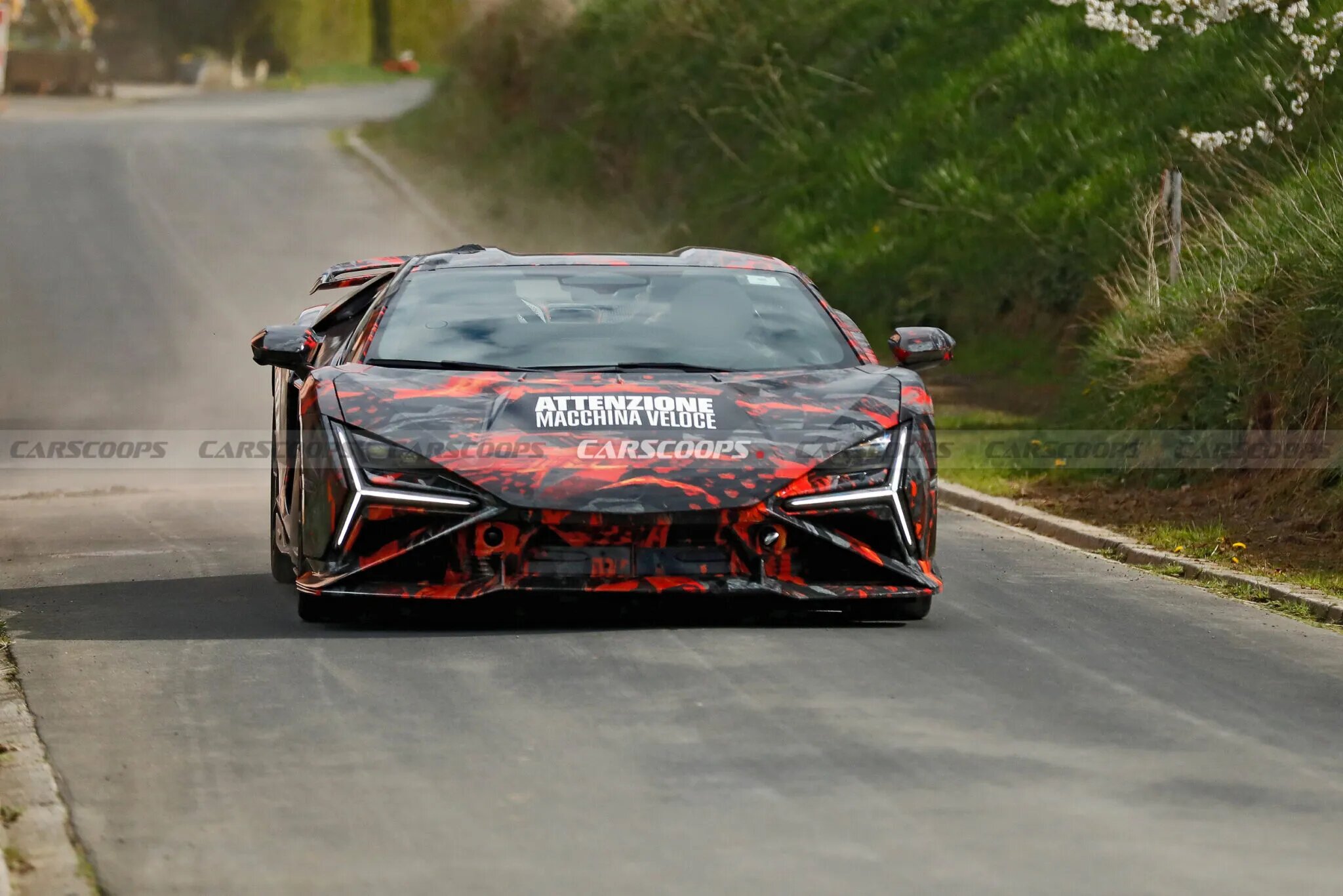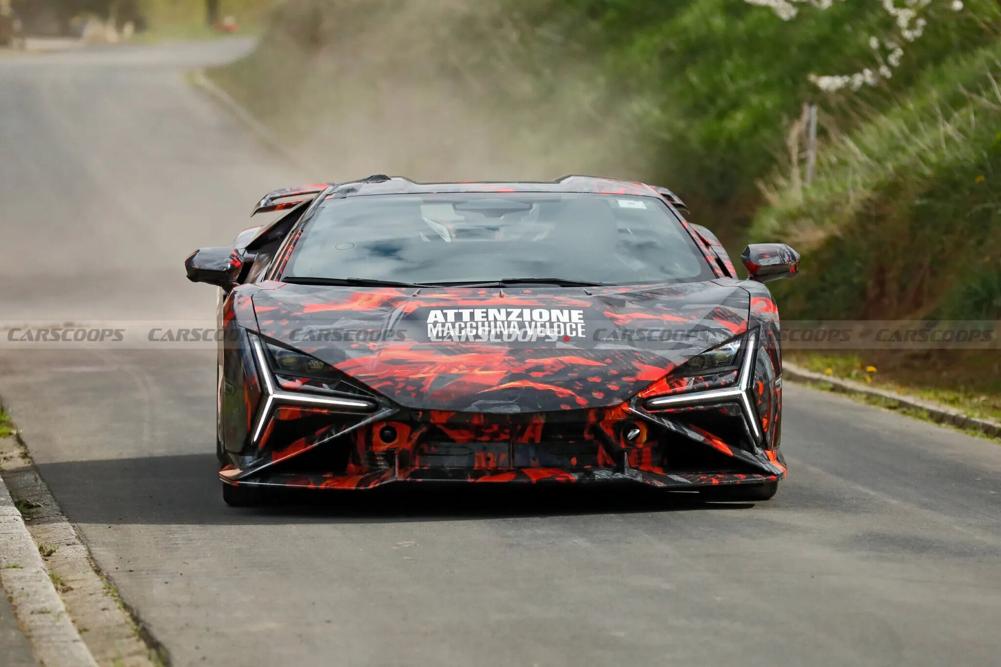 산타가타 볼로냐의 자존심, 레부엘토가 더 강력한 야성을 드러냈습니다. 뉘르부르크링에서 포착된 이 정체불명의 프로토타입은 거대한 리어 윙을 장착한 채 "Attenzione Macchina Veloce(고속 차량 주의)"라는 문구를 당당히 새기고 나타났습니다. 이는 아벤타도르 시절의 명성을 잇는 하드코어 버전, 'SV(Super Veloce)'의 등장을 예고하는 명확한 신호입니다.