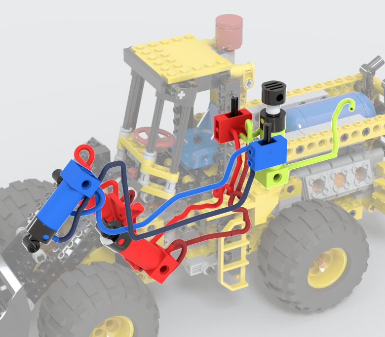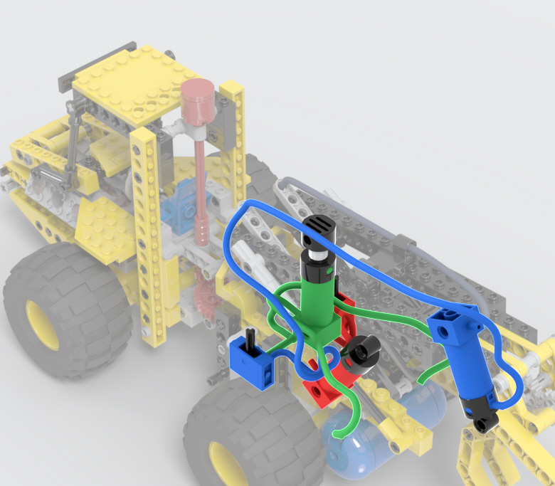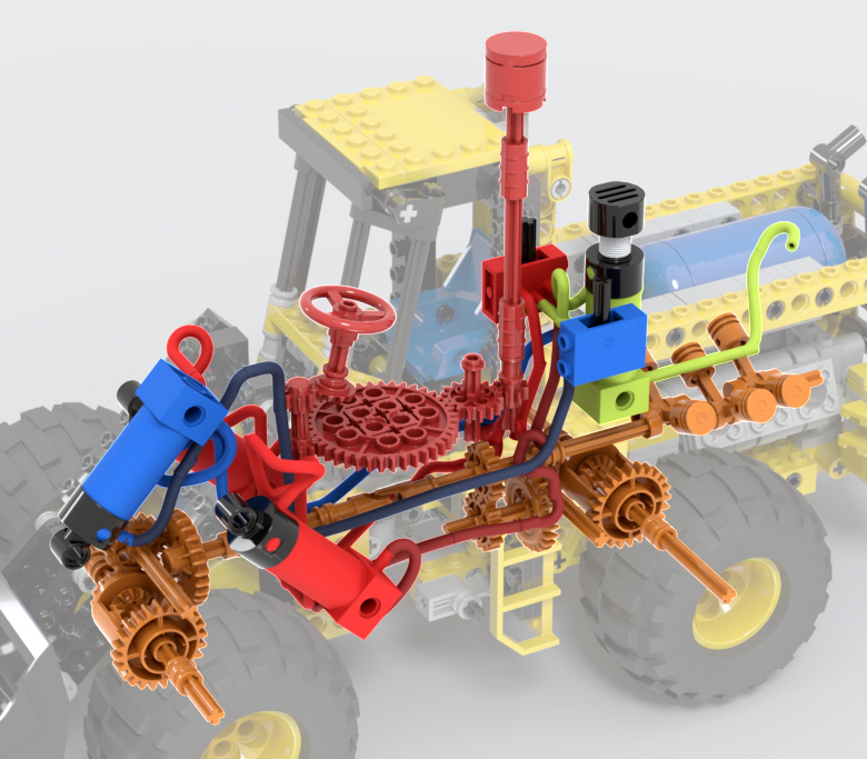 굴절식 조향 장치와 연결된 스티어링휠과 공압 실린더를 연결하고 있습니다.