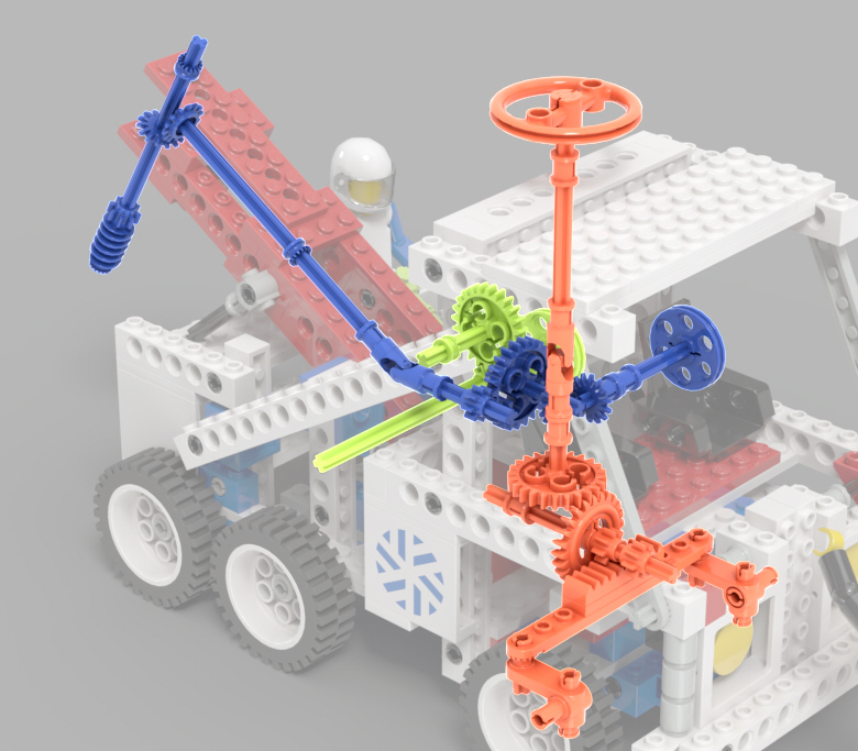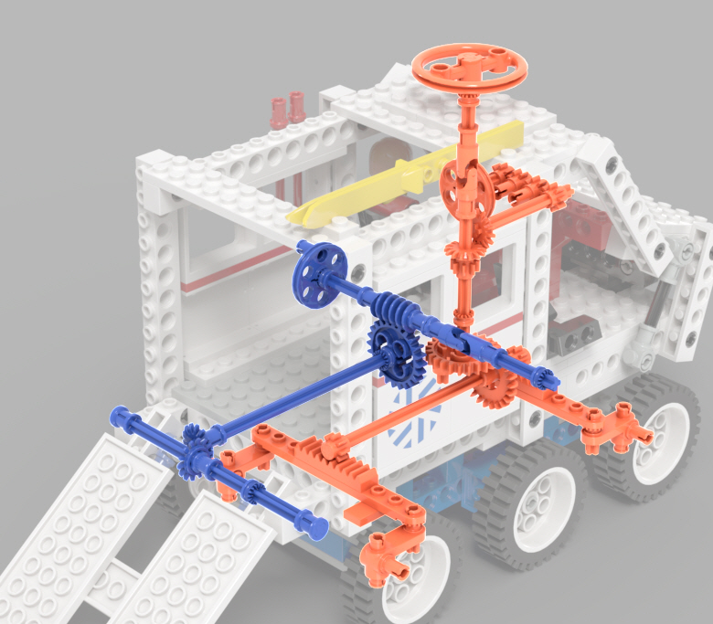 주황색은 조향용 기어들이고, 파란색은 뒷문을 열고 닫는 기어들입니다.