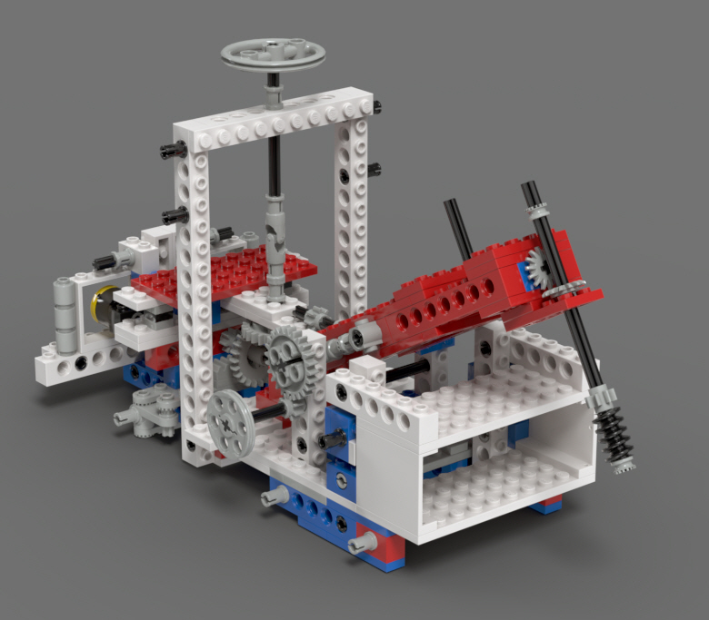 빨간색 기어들을 사용한 얼음에 구멍을 뚫는 드릴과 각도 조절이 되는 팔을 붙여서