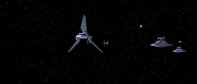 첫번째는, 스타 디스트로이어에서 출발하여, TIE 파이터 2대의 호위를 거느리고 데스스타2로 넘어가는 기체.