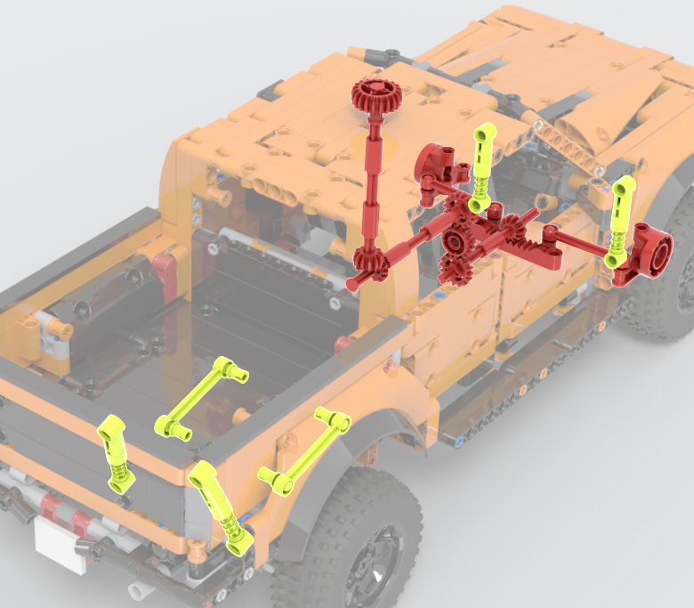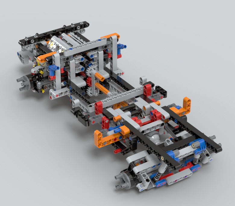 뒤쪽 구동축은 디퍼렌셜 기어가 들어간 큼직한 뭉치를 만들어서,