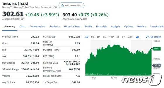 14일(현지시간) 뉴욕증시에 테슬라의 주가는 전거래일보다 3.59% 급등한 302.61달러를 기록했다.