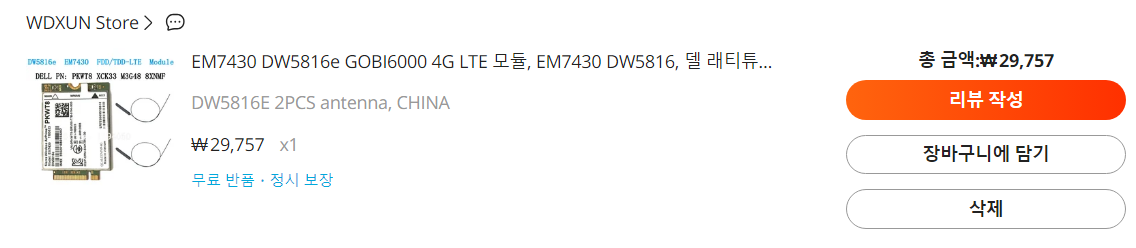 3. 노트북과 호환되는 셀룰러 모듈과 안테나를 구입한다.(델 공홈에서 드라이버 제공하는 제품으로 구입했습니다. 보통 모듈만 구입하면 안테나는 서비스로 넣어주는거 같습니다)