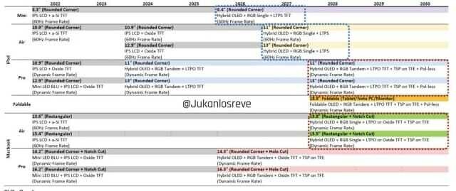 맥북 에어도 2028년 화면이 약간 더 커진 13.8인치 및 15.5인치 하이브리드 OLED 디스플레이를 채택하고 2028년에 출시될 것으로 알려져 있는 폴더블 제품도 탠텀 OLED가 탑재될 전망이다.