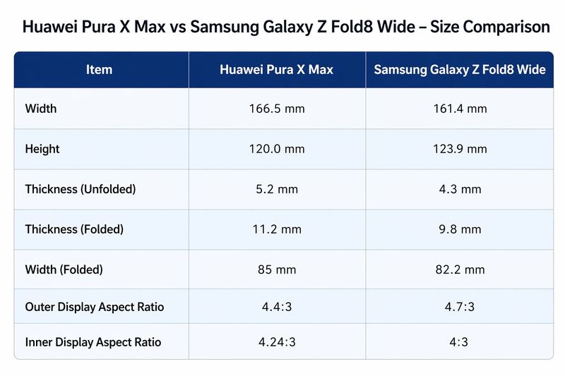 디스플레이 비율은 큰 차이를 보이지 않는다. 삼성은 외부 4.7:3, 내부 4:3, 화웨이는 외부 4.4:3, 내부 4.24:3 수준으로 예상된다. 두 제품 모두 가로 화면을 강조한 구조로, 넓은 화면 경험에 초점을 맞춘 점은 유사하다.