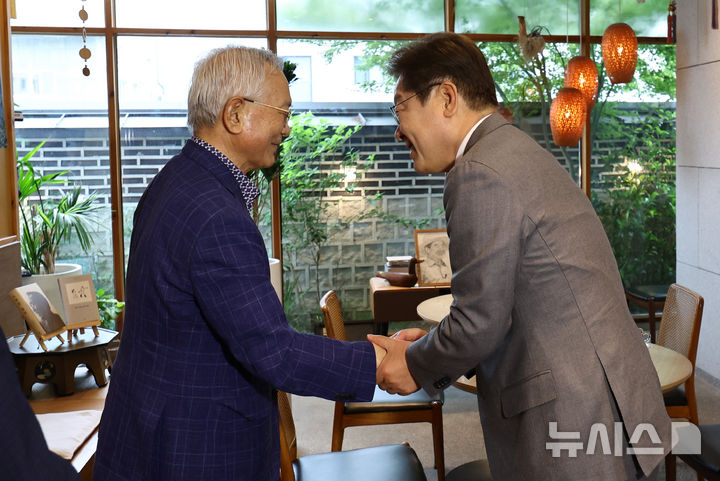 이재명 더불어민주당 대통령 후보가 22일 경남 양산시 소소서원에서 송기인 신부와 차담을 하고 있다.