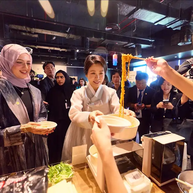 행사에 참석한 중동지역 K-푸드 인플루언서들과 UAE 대학생들은 최근 한국 관광객의 필수 코스로 자리 잡은 ‘한강 라면’ 조리 기계를 체험하며, 버튼 몇 번으로 간편하게 라면을 조리할 수 있는 점에 큰 관심을 나타냈습니다. 김혜경 여사도 UAE 현지인과 함께 불닭볶음면을 시식하며 “오히려 UAE 현지 분들이 매운 음식을 더 잘 드신다”고 말해 웃음을 자아냈습니다.