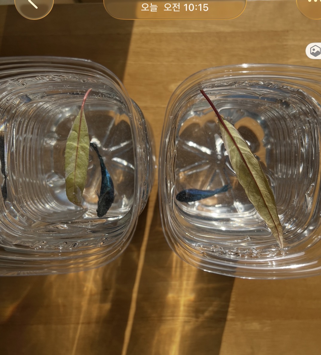 5월에 입양한 베타피쉬가 만 7개월 넘게 생존 중입니다. 유리 수조가 청소하다가 깨진 뒤로 생수통에 키우고 있어요. 정말 기특한 녀석들이예요. 매일매일 살아 주는 것만으로도 고맙지 뭐예요. 생존력 짱!