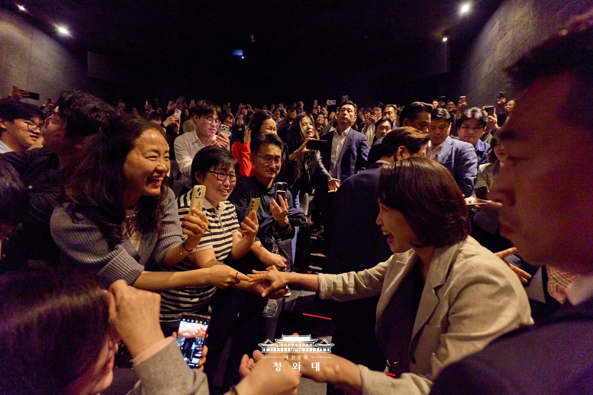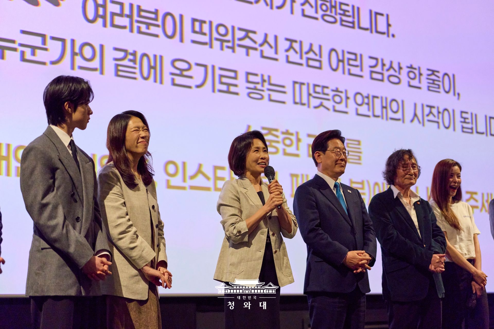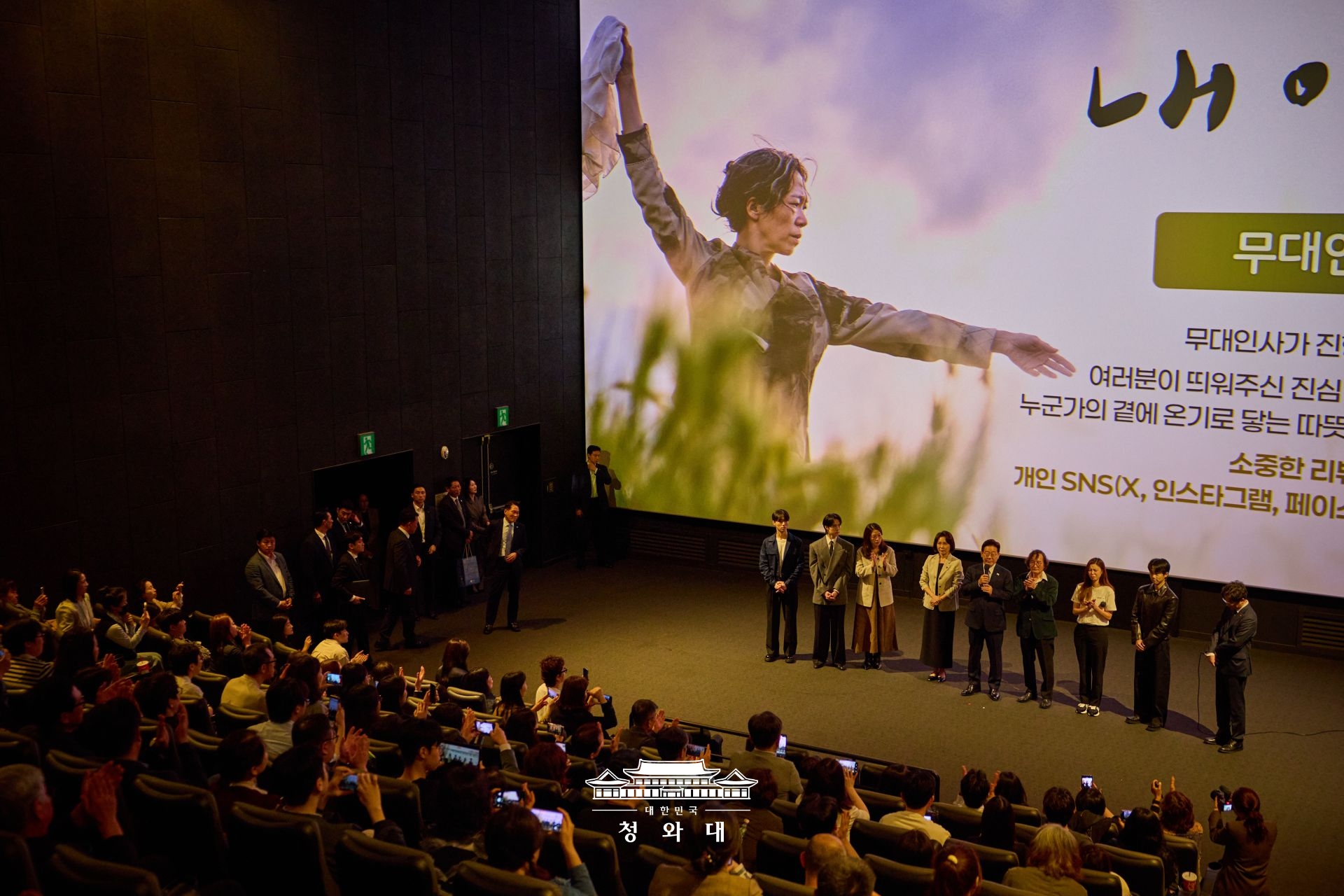 관객들의 박수와 연호 속에 밝은 미소와 함께 양손을 흔들며 상영관에 입장한 이재명 대통령과 김혜경 여사는 환영하는 관객들과 일일이 악수를 나눴고 1열에 앉은 관객은 ”속앗수다”라고 제주어로 인사를 건네는가 하면 관객석 곳곳에서 “제주에서 왔습니다”, “강원도에서 왔습니다”라고 외치기도 했습니다.