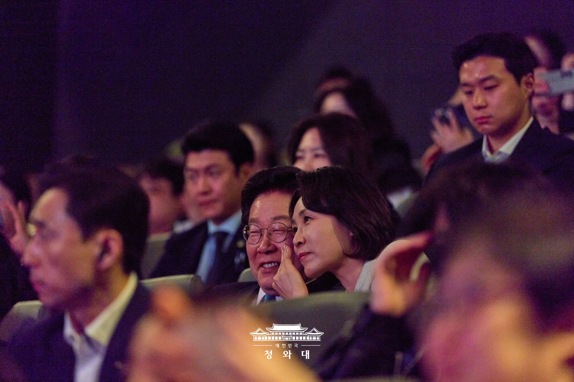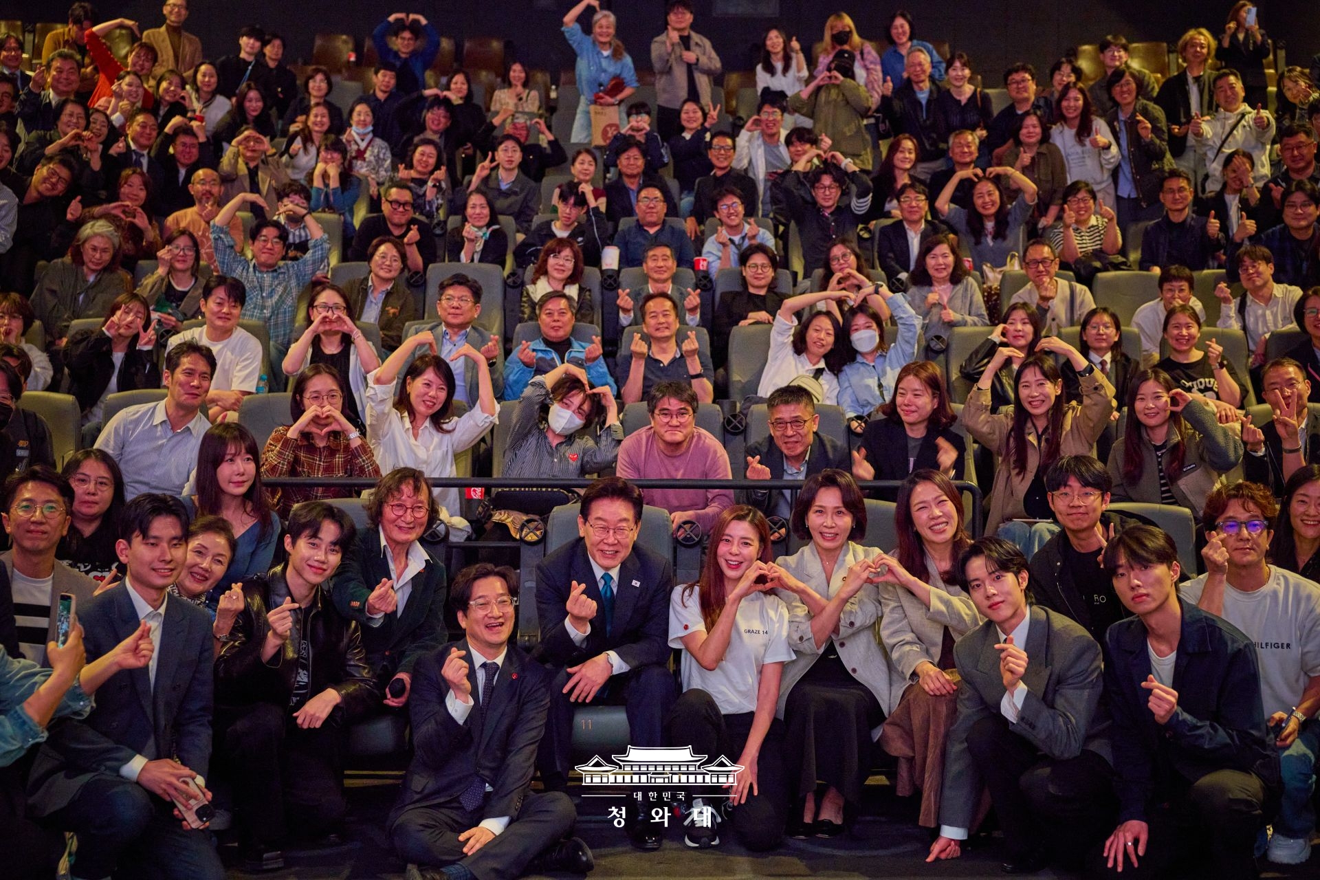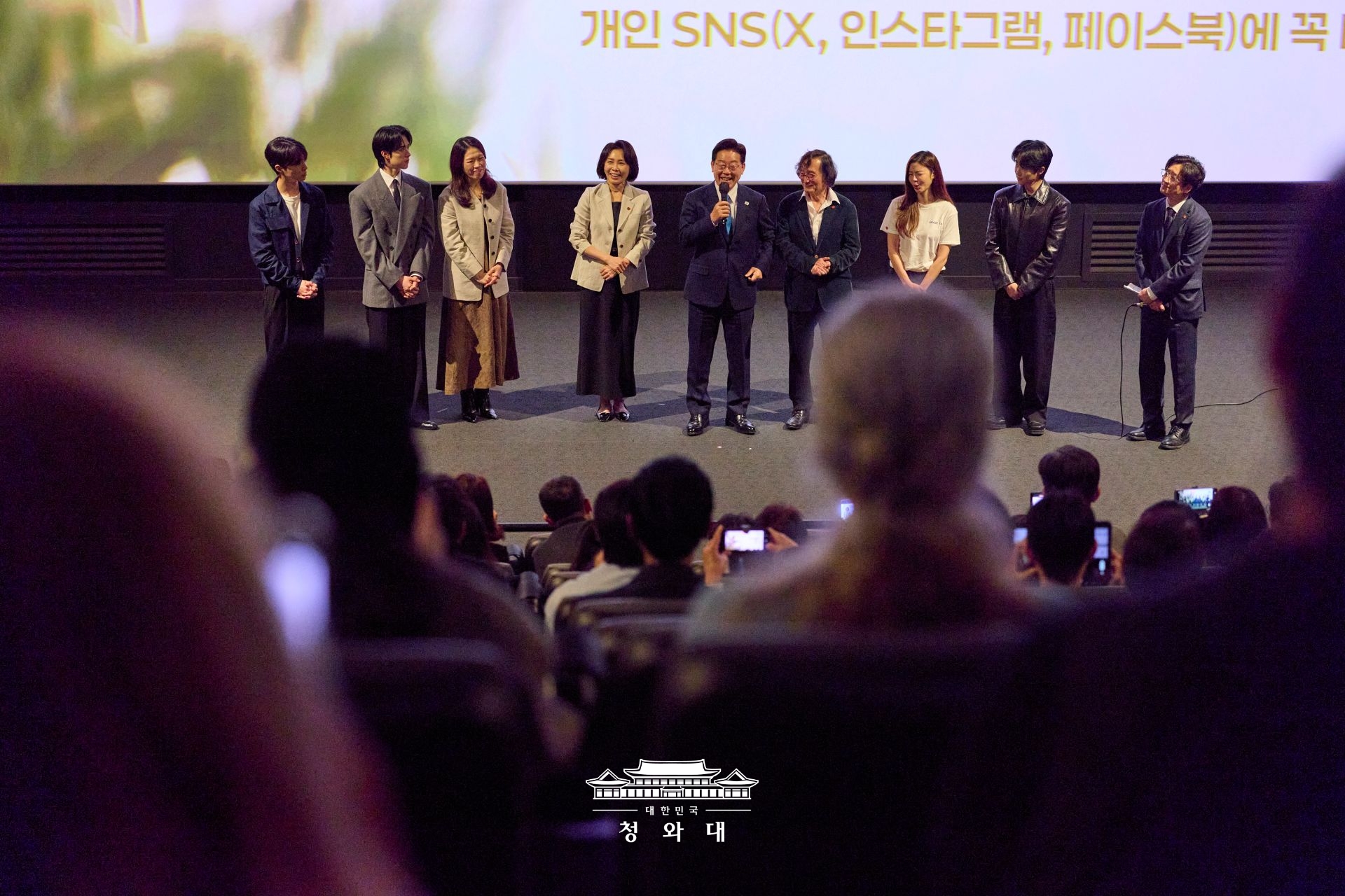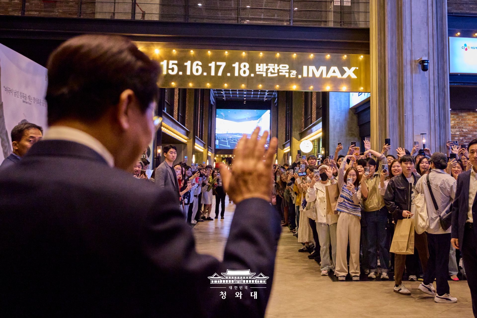 관객들의 박수와 연호 속에 밝은 미소와 함께 양손을 흔들며 상영관에 입장한 이재명 대통령과 김혜경 여사는 환영하는 관객들과 일일이 악수를 나눴고 1열에 앉은 관객은 ”속앗수다”라고 제주어로 인사를 건네는가 하면 관객석 곳곳에서 “제주에서 왔습니다”, “강원도에서 왔습니다”라고 외치기도 했습니다.